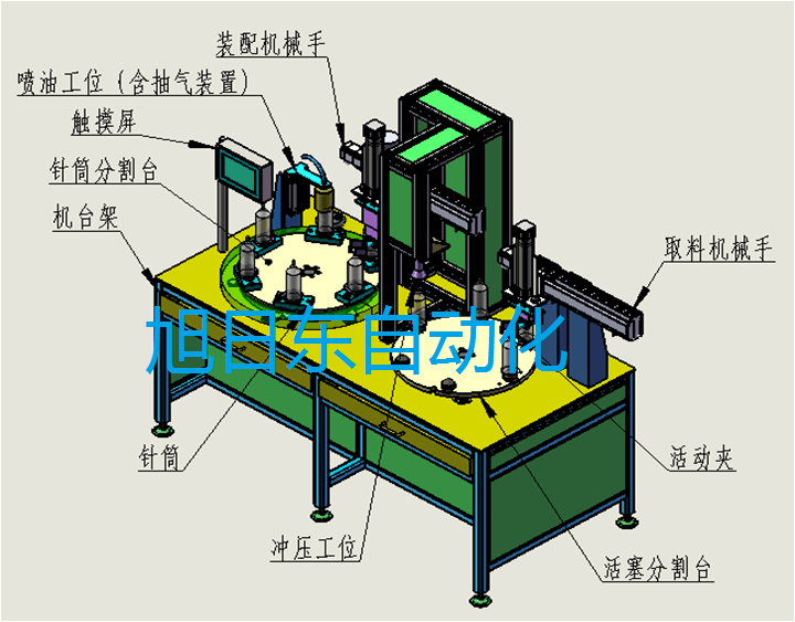 此方案采用了兩臺360°間歇分割器分別配送針筒及活塞到指定位置再機械手自動抓取裝配;途中實現(xiàn)自動夾定位,自動噴涂潤滑硅油,實現(xiàn)自動松開夾具等功能;裝配完成后采用了機械手自動下件功能。